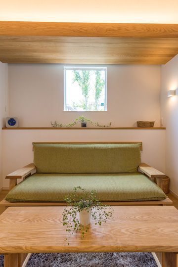 晩酌が共通の趣味というご夫妻がくつろぐリビングのソファーコーナーは、天井の無垢のオーク材や間接照明の光の効果で、心和める空間となっています。「暖色系の光が心地よく、気持ちよくお酒が飲めます」とご夫妻。昼間はピクチャーウインドウから、緑の景観が楽しめて清々しい雰囲気に包まれています
