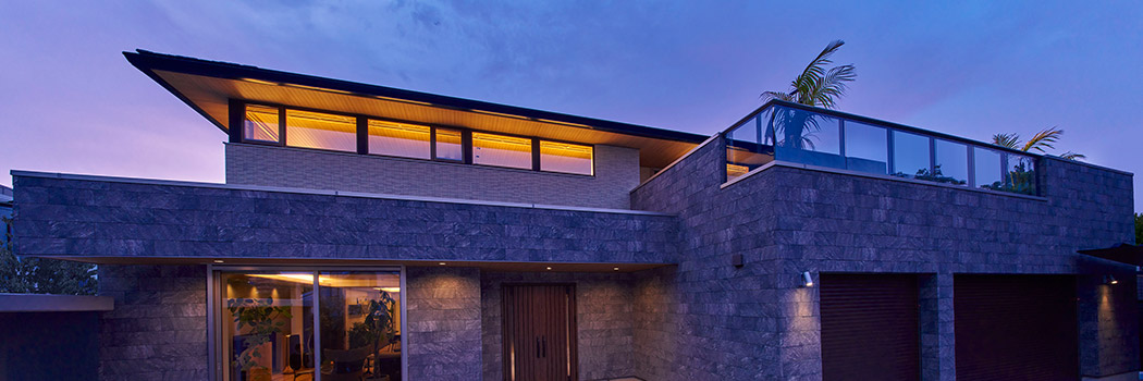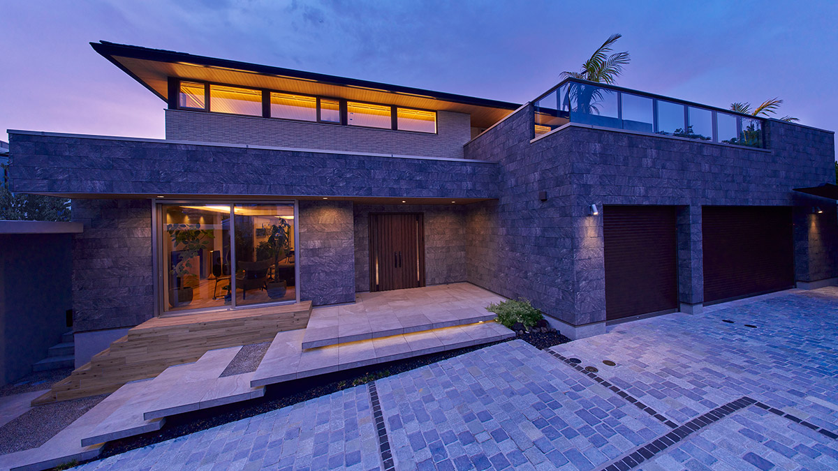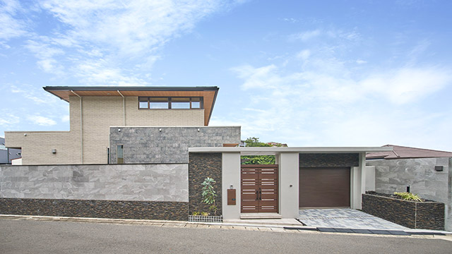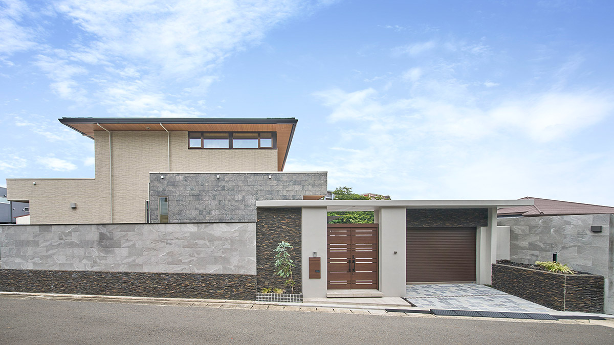プライバシーを守りながら、目の前に広がる緑豊かな公園の眺望を取り込んだ美邸。お車を安心して導けるよう、緩やかな勾配を設けました。そのラインは邸宅の個性として愛着を育みます。さらに、ビルトインガレージはグランウッド工法により3台並列を実現。外観はタイルと水平ラインで端正に整え、室内には吹き抜けの玄関ホールや上質なリビング、小さな石庭のある和室など、多彩な空間をつくりました。街並みを美しく彩り、住まう人の時間を豊かにする一邸です。