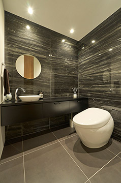 煌びやかな鏡面仕上げのタイルによって、ラグジュアリーホテルを思わせる雰囲気に。日常に非日常感を添え、ゆとりある広さが落ち着いた時間を演出。柔らかなダウンライトの明かりや家具のような洗面カウンターで、上質感をさらに際立たせました。