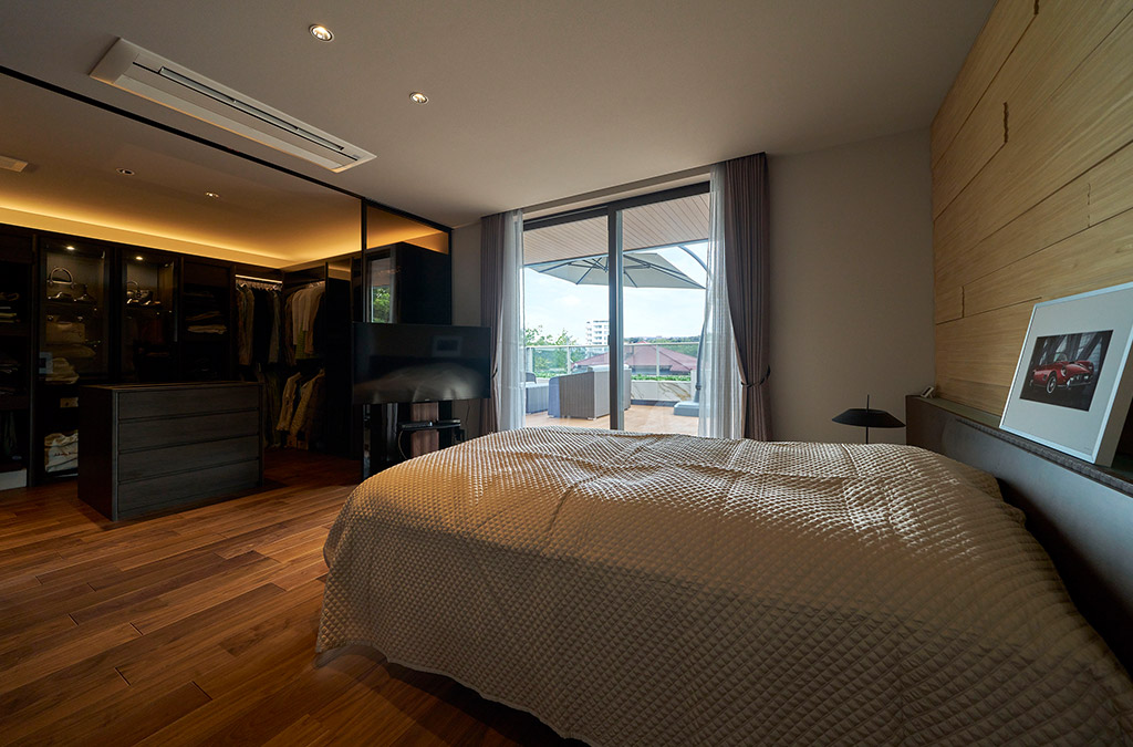 深みと落ち着きのあるウォルナットの床材を基調にした、2階の主寝室。艶やかなブラックガラスで曖昧に仕切られたウォークインクローゼットは、洗練されたインテリアのような上質さを漂わせます。ルーフガーデンとつながる窓を通して、明るさと開放感に満ちたプライベート空間に仕上げました。