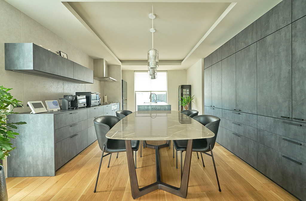 表情豊かで気品に満ちたダイニングテーブルを主役に据えたダイニング・キッチン。ダークトーンで統一されたスタイリッシュな収納で、空間を引き締めました。窓から心地良い光が届くキッチンは明るく開放的で、日常のシーンをより上質に彩ります。