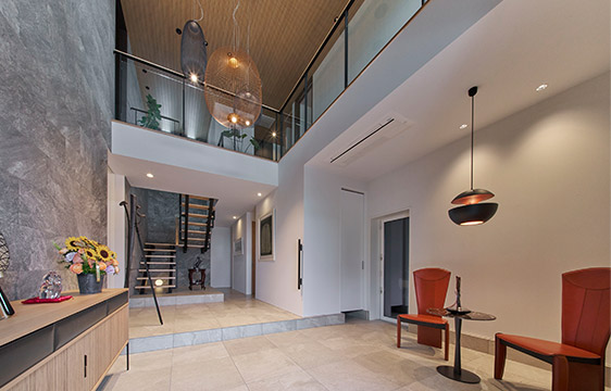 扉を開けた瞬間、圧倒的な開放感に包まれる玄関ホール。約5.7mの吹き抜けが描く大空間に、抜け感のある階段や手すり、天井までつづくグレーの壁面を巧みに組み合わせることで、実面積以上の広がりを体感できます。上質感漂う大判タイルの床や凛とした存在感を放つインテリアもポイント。ゲストを魅了する迎賓空間をつくりあげました。