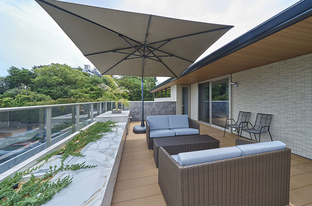 目の前に緑豊かな公園が広がるルーフガーデン。周囲の視線を巧みに遮る工夫により、外にいながらも内にいるような安心感に包まれます。風と光を感じながら寛げるこの居場所は、暮らしの楽しみを広げるとともに、外観を美しく引き立てるアクセントにもなっています。