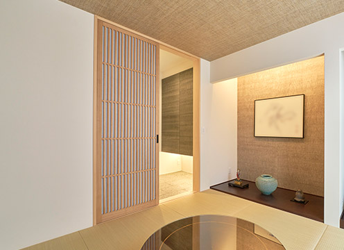 御影石を敷いた廊下に導かれて辿り着く、リビングやダイニングから独立した和室。まるで隠れ家のように落ち着いた雰囲気を醸し出しています。奥にはこだわりを重ねた小さな石庭を設け、心和む風情を演出。家族の寛ぎの場としても、ゲストをもてなす場としても、深い安らぎをもたらします。
