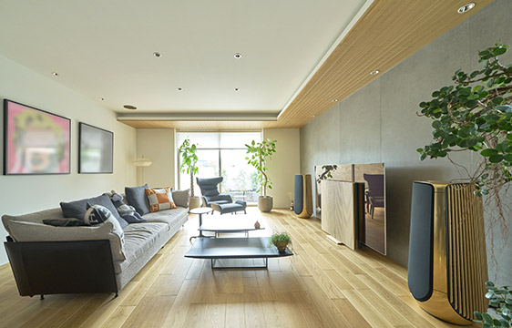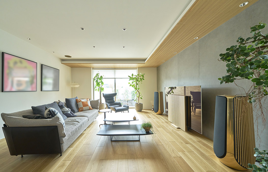木の質感を活かしたナチュラルな雰囲気のリビングは、家族が心地よく過ごせる居場所。格調高い家具と潤いをもたらすグリーンが響き合い、穏やかな時間を紡ぎます。夜にはL字型の折り下げ天井から柔らかな光が広がり、上質な安らぎを演出します。