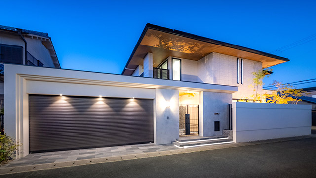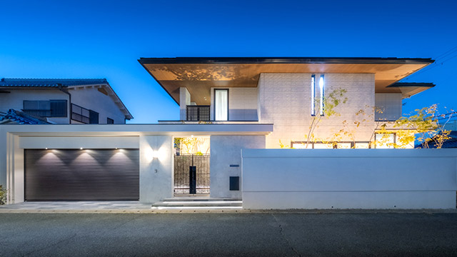 同系色で揃えた建物と外構が一体感のある外観。1階中央の連続窓を低く抑えたことで上階の壁面をすっきりと見せています。また、大きく架かった屋根の深い軒や、左右に設けたフラットルーフの水平ラインが、角地の外観に品格を漂わせます。