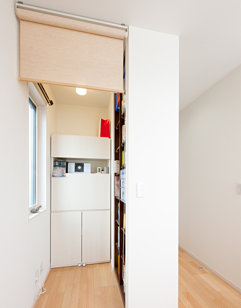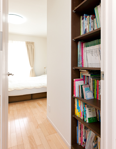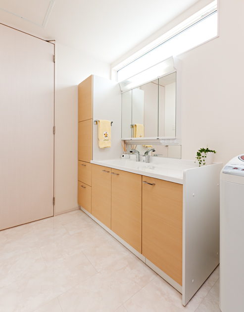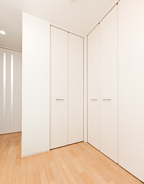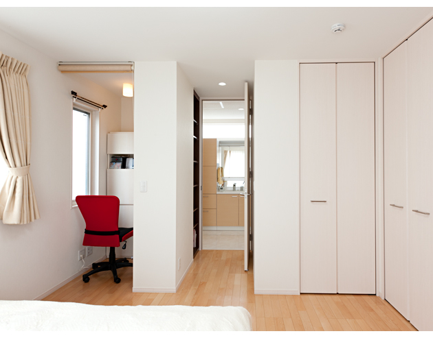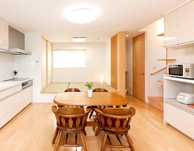 2匹の愛猫を飼い、とても可愛がっていらっしゃるご夫妻。一緒にいかに楽しく、ストレスなく暮らせる家にするかを考え、キャットステップやくぐり穴、専用のトイレスペースや換気扇などをご提案しました。都心の限られたスペースを有効に使うために極力廊下をなくす、ホテルのように部屋から水回りに行ける間取りなど、細部まで考慮して設計させていただきました。