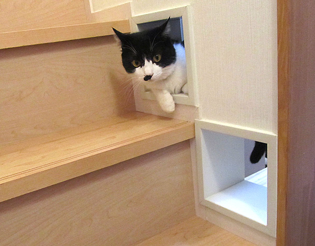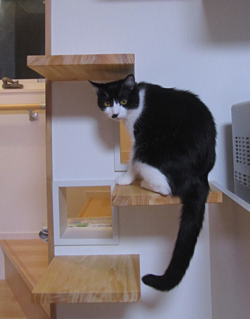 キャットステップで寛ぐ、あんこちゃん。愛猫にやさしい家づくりもご夫妻の希望を実現したもの。「ペットとの暮らしを含め、いろいろご提案してくださったことに満足しています」と夫人