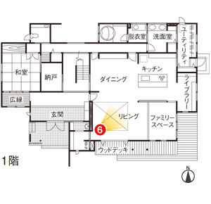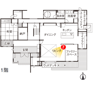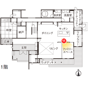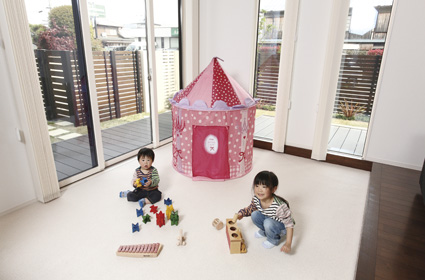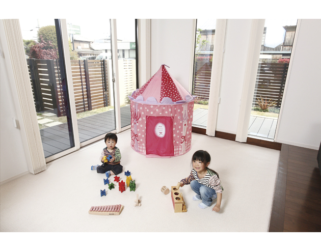 ファミリースペースをリビングの一角に設けたNさま邸。床を一段下げてカーペット敷きにし、お子さまが座ったり寝転んだりしながら遊べる空間です。「LDKから目が届くので安心です」