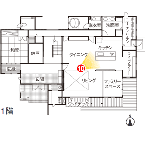 キッチンと行き来しやすい直線上の動線に設けられたダイニング。大きくゆったりしたサイズのテーブルを置きたいとの希望から10帖の広さを確保しています