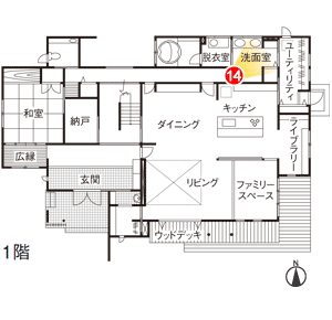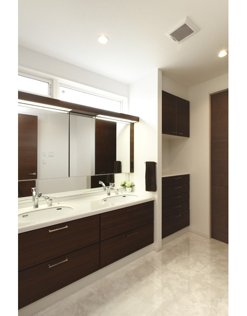 洗面室は、廊下側とユーティリティ側から出入りできる2WAYの間取りです。シンクを2つ設けて、忙しい朝の支度もスムーズに。収納もたっぷり備えています