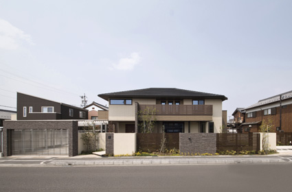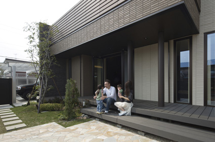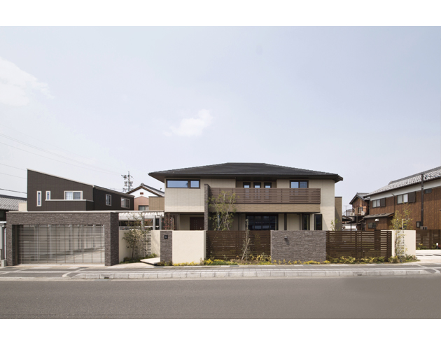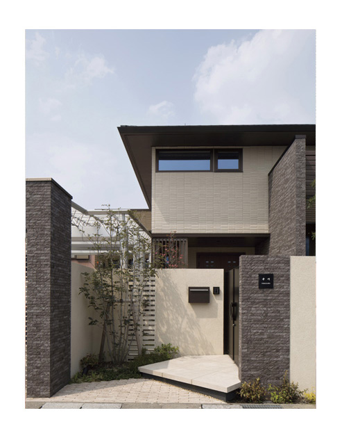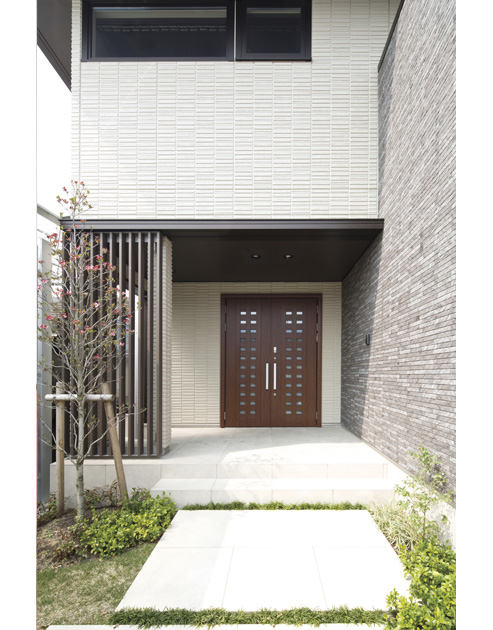 ブラウンを基調とした外観には、所々にタイルをあしらって変化をもたせて美しく重厚感ある佇まいに。外構もテイストを合わせ、お客様を迎えるにふさわしい上品な雰囲気となりました