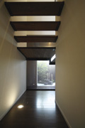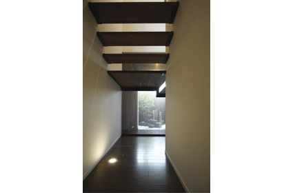 スケルトンの折り返し階段の下も、坪庭の眺めとも相まって、趣のある空間を演出しています
