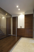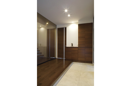 ファブリックガラスの仕切り壁が視界を広げる、開放的な玄関