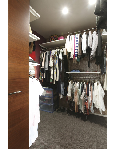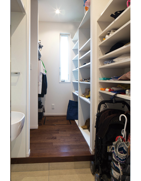 「帰宅したらまず着替えてからリビングでくつろぎたい」と、玄関とリビングの間にクローゼットスペースを確保。天井に埋め込み式のヒーターを取り付けているため、冬場の着替えの際も寒くありません。シンクも設けてあり便利です