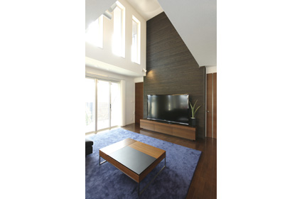 吹抜けの上部からも光が注ぐ、開放的なリビング。単調な空間にならないように、杉のボーダーパネルを張ってアクセントにしています