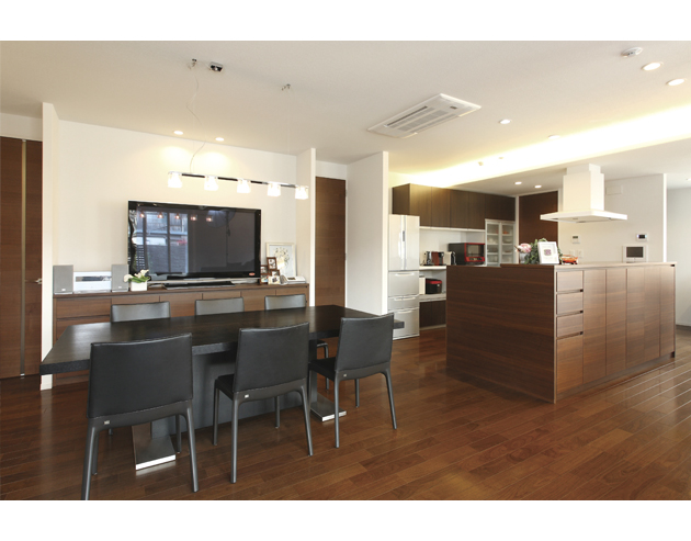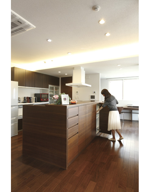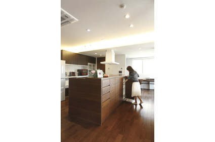 ブラウンを基調にタイルをアクセントにした重厚感ある外観や、大空間のLDK、壁に杉のアクセントウオールを張ったり、ウォールナットの家具でインテリアをコーディネートしたり。さらに家事が効率よくできる動線も考えていただきました。漠然としていた理想を形にしてもらえたと思います。
