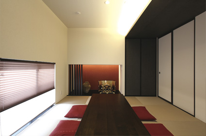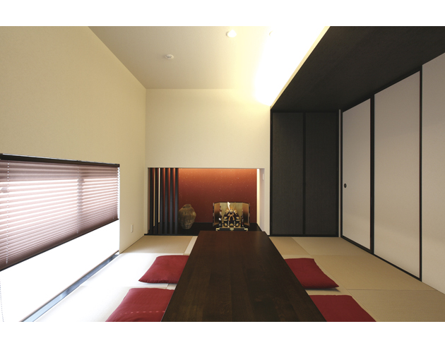 ご両親やご友人など、来客をもてなすための和室。えんじ色の床の間をしつらえ、縁なしの半帖畳を採用した、モダンな空間に仕上がりました