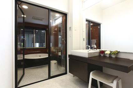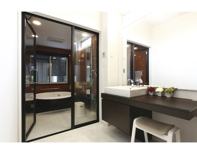 脱衣室との仕切りがガラスになった開放的な浴室。窓越しに見える坪庭の眺めに心癒される空間です