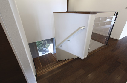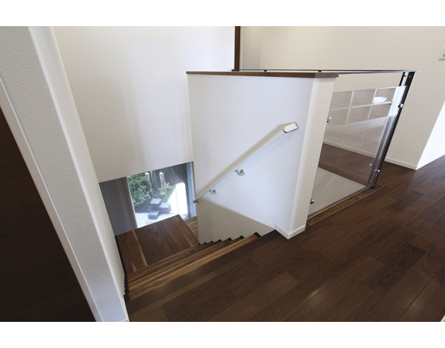 生活空間の広さにこだわり、階段の幅も広めの1200㎜に。昇り降りの際、ファブリックガラスを通して坪庭を眺めることもできます