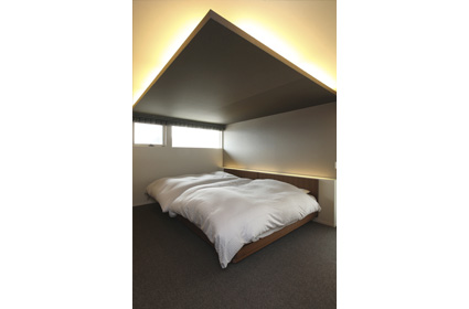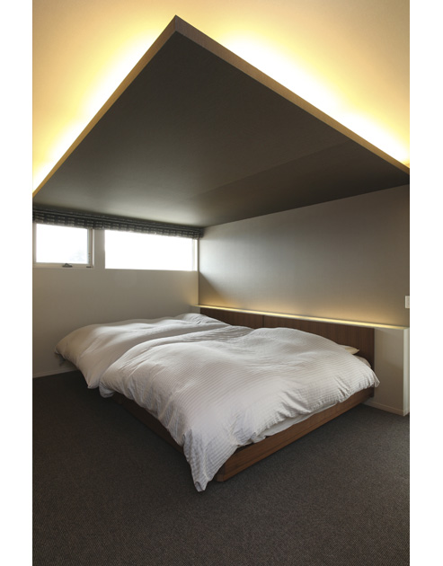 寝室はグレーの天井にコーブ照明を採用。枕元のカウンターにも間接照明を設置するなど、光が直接目に入らない照明の工夫でくつろげる雰囲気に