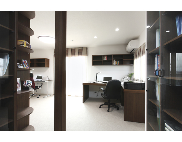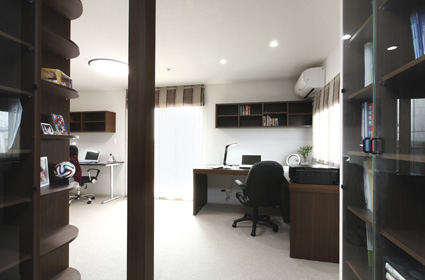 自宅で仕事をすることも多いというご夫妻は、書斎のスペースもしっかりと確保。L字型の部屋の形を利用し、奥の壁面に本棚を造作。ご夫妻それぞれのカウンターも造りつけています