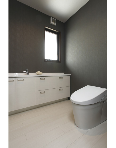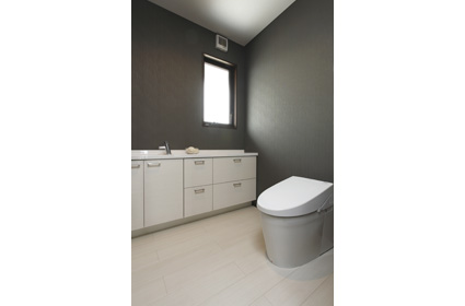「新聞を広げてもゆとりがあるトイレがほしい」というNさまの希望からトイレは2帖の広さに。便器の蓋の開閉や水洗が自動でできる設備も重視されました
