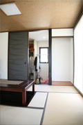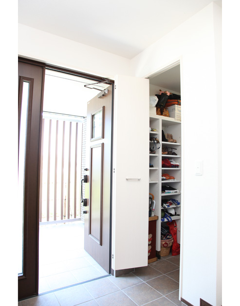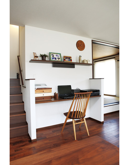 和室の広い納戸が便利ですね。急な来客でもすぐに物をしまうことができます。リビングとのつながりを考えて、3枚の戸襖を引き込めるようにしてくれました。玄関のアクセントウォールは端材を活用して粋な演出をしてくれたもの。階段横のPCコーナーも提案してくれたものです。