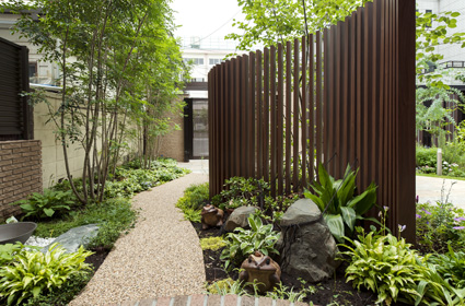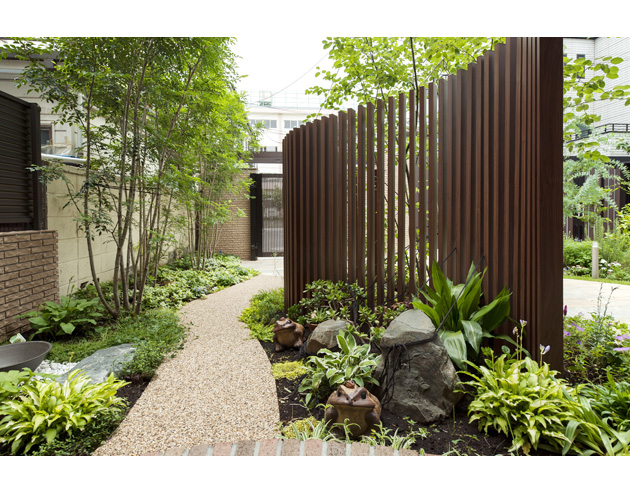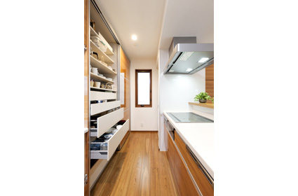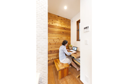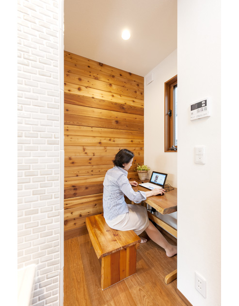 道路から見た際の塀を含めた家全体のイメージ、総タイル外壁の彫りが深く上品な外観デザイン、緑の中を通って玄関まで行けるS字を描くタイルのアプローチなどにこだわりました。近隣に3階建ての家が多いので、視線をゆるやかに遮る目隠しにも配慮しています。インテリアはログハウス好きの妻の好みに合わせてブラウンを基調に。杉の無垢板を貼ったキッチン横の家事コーナーも希望を叶えたものです。