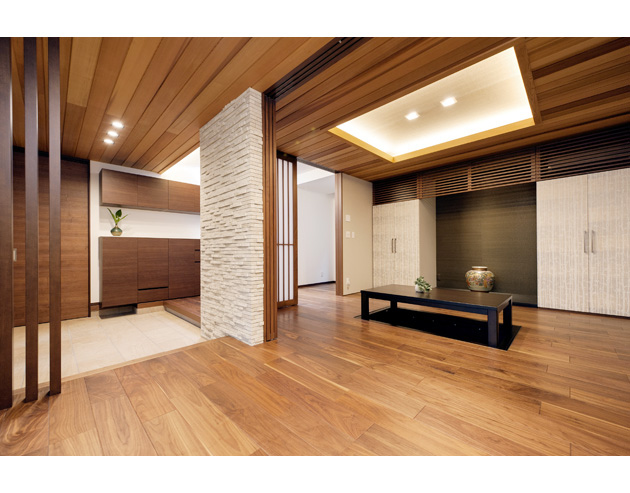 折り上げ天井、板張り、タイルなどアクセントが多い豪華な仕様なので、現場もやりがいがあり、細部まできれいに仕上がるように施工に細心の注意を払いました。特に1階は「見せる」空間ですから、色合いにも気を配りました。Tさまは毎日のように現場にお見えになったので、一緒にお話をしながらつくっていったのも良い想い出です。また、Tさまはいつも「森君は息子と同い年」と言って、息子のように接してくださいました。Tさまのお宅を担当したことで、自分自身が成長できたと実感しています。