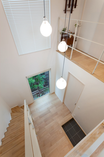 「来客の多くは玄関しか目にしないので、広くキレイな空間にしたい」と、Fさまがこだわった玄関。10畳の広いホールに吹抜けを設けたことで、開放感が増しています。吹抜けに吊り下げられたペンダントライトが縦方向に広がりをもたせています