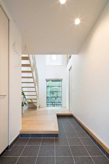 玄関をより広く開放的にするため、框の形状を工夫し、正面には坪庭の緑を楽しめるピクチャーウインドウを設置しました。2階の窓からの光が注ぐ明るい玄関は、お客さまをお迎えするのにふさわしい雰囲気です