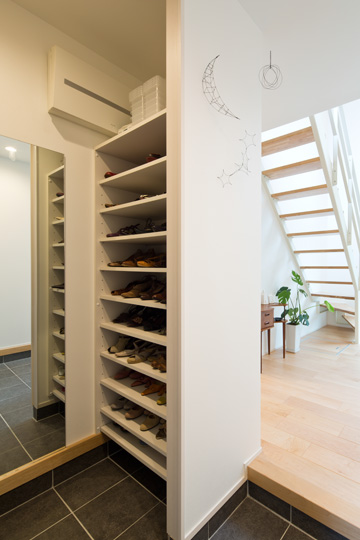 玄関ホール空間をすっきりとさせ、ピクチャーウインドウを引き立たせるために、下駄箱ではなくシューズクローゼットに。姿見を備えているため、このスペースでお出かけ前のコーディネートチェックもできます