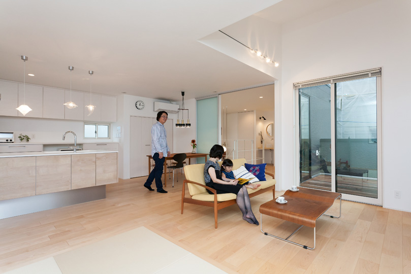 目の前の道路からの視線が気にならないよう、2階に開放的なLDKを配置。リビングの半分ほどを、フローリングとフラットにつながる畳スペースに。子どもを遊ばせたり、横になってくつろいだりすることができます