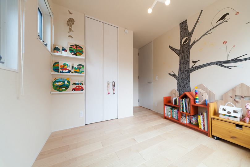 壁には飾り棚やウォールステッカーをあしらい、北欧風のカラフルでポップな雰囲気にしました。女の子の部屋ということで、外からの視線が気にならないよう窓は小さめに。その代わり3カ所に設置したので、採光は十分得られます
