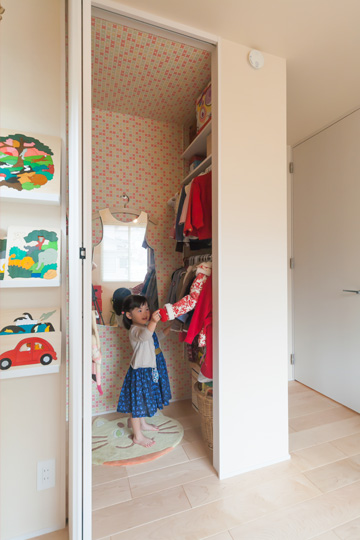 子ども部屋は、クローゼットにもこだわりが。壁には花柄のクロスを張り、鏡を設置して、服を選んだり、コーディネートをチェックすることができるスペースに。可愛らしい衣装部屋といった趣で、おしゃれが楽しくなりそうです