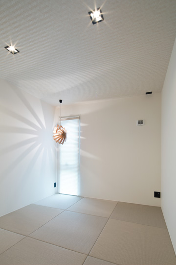 半帖畳と白いクロス、白い網代風の天井クロスでシンプルにまとめた和室。あえてコーナーに設置したペンダントライトや、黒い照明スイッチやコンセントプレートをアクセントとして採用しています