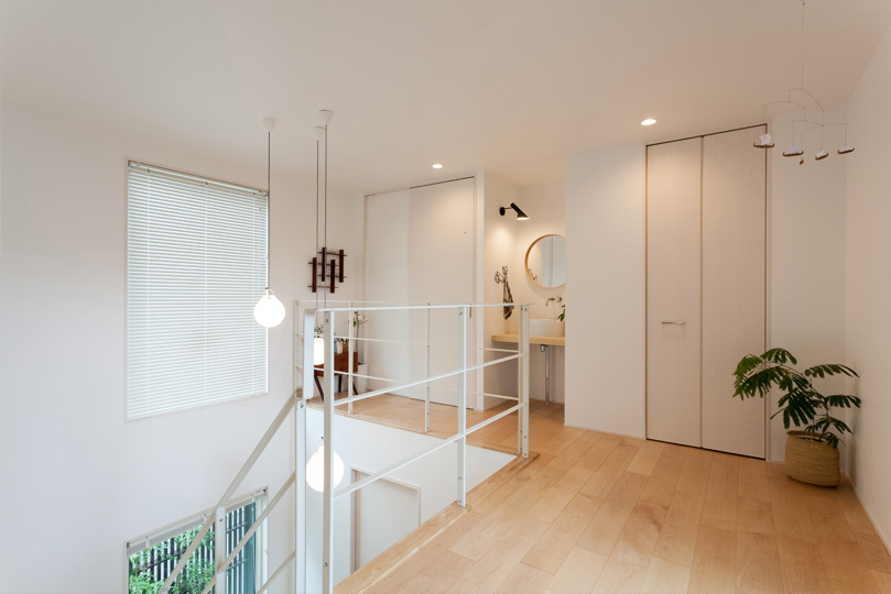 吹抜けに面した2階ファミリースペース。「ここはウッドデッキ(バルコニー)にも面していて、風が抜けて気持ちがいいんです。バルコニー越しに空が見えるので、娘とお月見したりしています」(Fさま)。贅沢な空間使いが、生活にゆとりをプラスしています