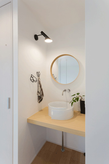 吹抜けを挟んでLDKの反対側には、洗面台を設置。渦巻きのような形状の洗面ボウルや、アイアン製のアートのようなタオルかけ、水栓、照明、鏡と、すべてFさまがこだわりぬいて選んだものを使用しています