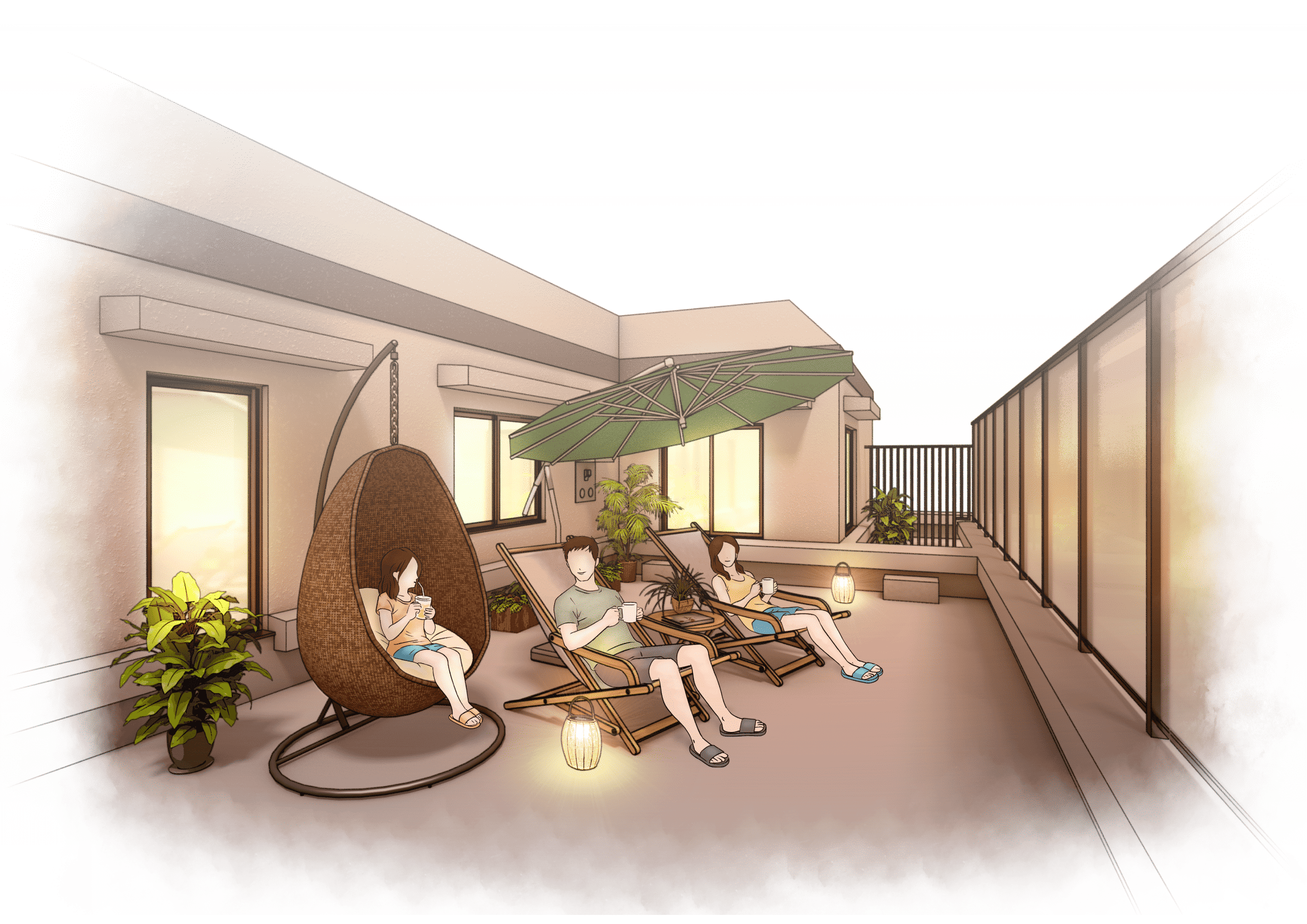 ※ルーフバルコニー完成予想イラストは設計図書を基に描き起こしたもので、実際とは多少異なる場合があります。家具・家電・調度品等は販売価格に含まれません。ルーフバルコニーの利用方法については管理規約により定めがあります。詳しくは係員にお尋ねください。