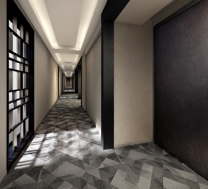 【建物デザイン・共用部】 ホテルライクな共用空間が、暮らしの質を高める。 〈ペット同伴可ルーフテラス〉〈ホテルライクな内廊下〉〈ラウンジ〉