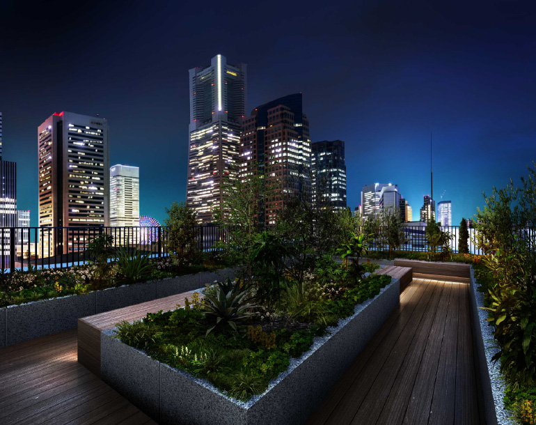 - ※ルーフテラス完成予想CGは、現地屋上階相当の眺望写真に設計図書を基に描き起こした完成予想図をCG合成したもので、実際とは多少異なる場合があります。