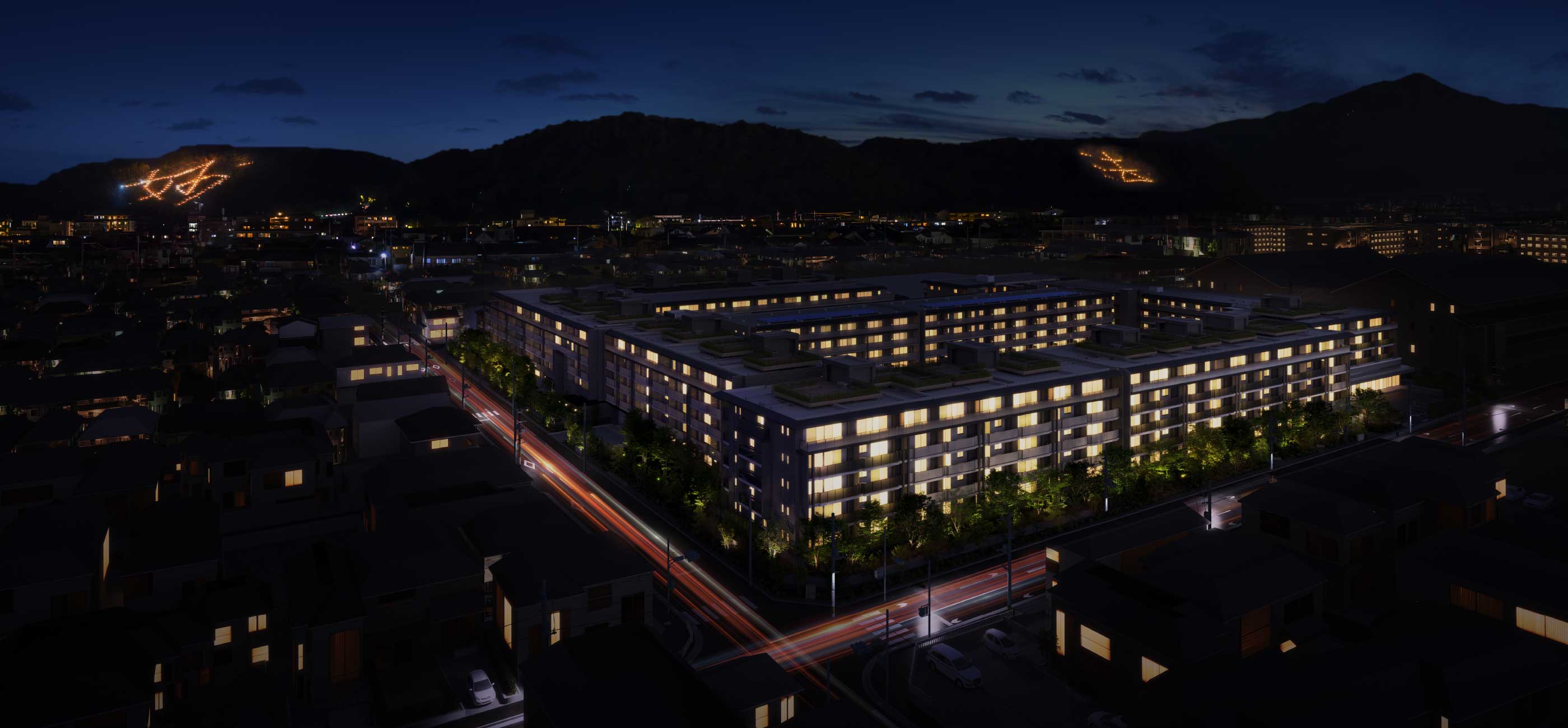 高野川と賀茂川に挟まれた虎の背山の山麓に広がる松ケ崎。雄大に描かれた、地上5階建・総394邸のファサードデザインには、悠久の歴史と自然、そして人の営みが溶け合う街と、いつまでも寄り添っていけるような味わい深い佇まいを求めました。敷地を囲む豊かな樹々と、その緑に映える色調のタイルが美しい景観を描き、時とともに深みをだす京都庭園レジデンスを創りだします。