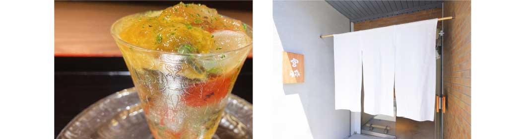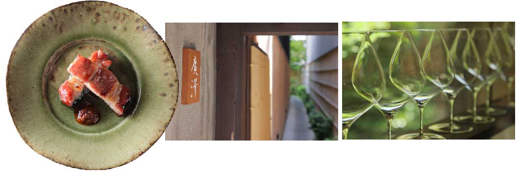 店内は設計事務所HIRAMATSUGUMIやハタノワタル氏による特別な内装。料理に添えられる器やグラスには貴重な骨董品などが使われ、季節ごとにお料理と共に器も表情を変える。季節の食材を丁寧に仕立てる京料理を提供している。