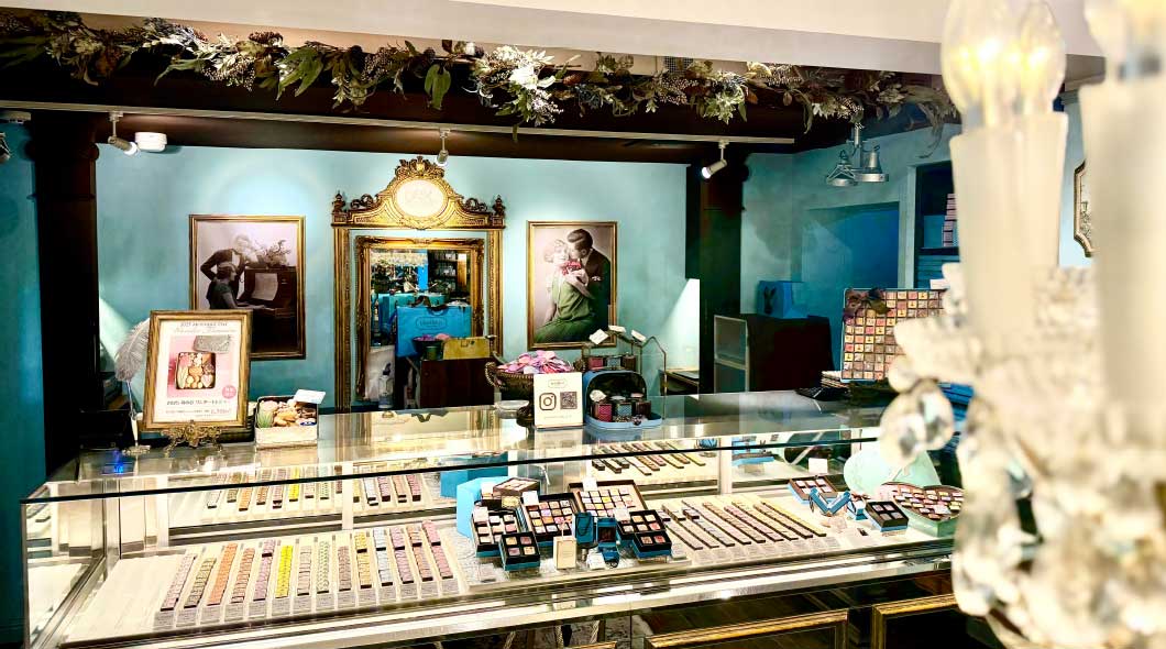 アーティストがデザインしたガナッシュには、一つひとつに物語がある。厳選されたカカオ豆と秘伝のレシピから職人が生み出すのは、濃厚なのに軽やかなチョコレートの世界。古民家を利用した店舗の奥にはカフェスペースも。