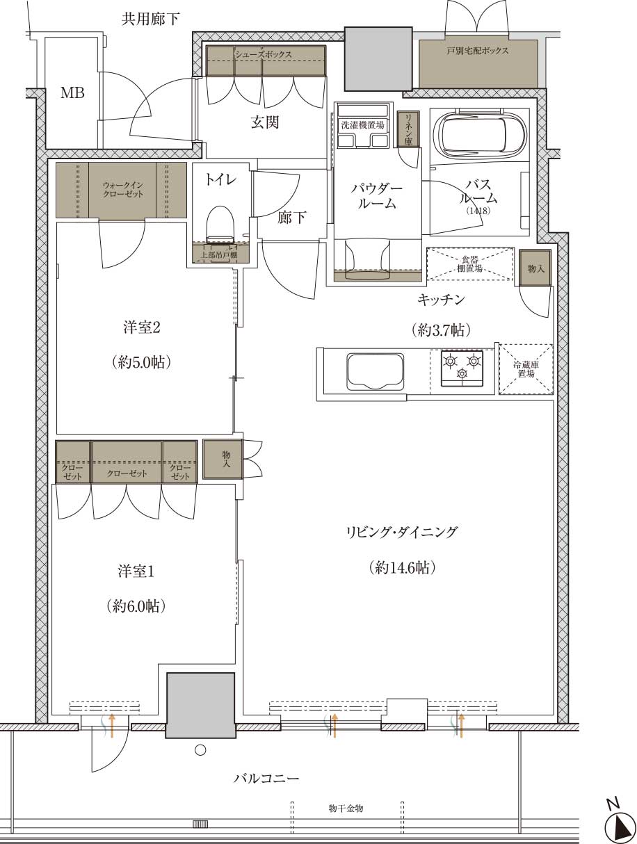 南面に2つの洋室を配した、開放的な2LDK東南角住戸。