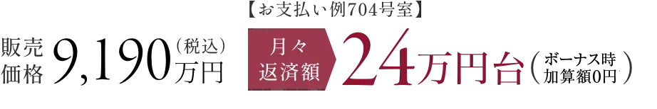 返済例/販売価格:9,190万円(税込) ○頭金:190万円(諸費用が別途必要です) ○借入金額:9,000万円(内、ボーナス時加算額0円)※月々のご返済の他に管理費・修繕積立金等のご負担が必要です。