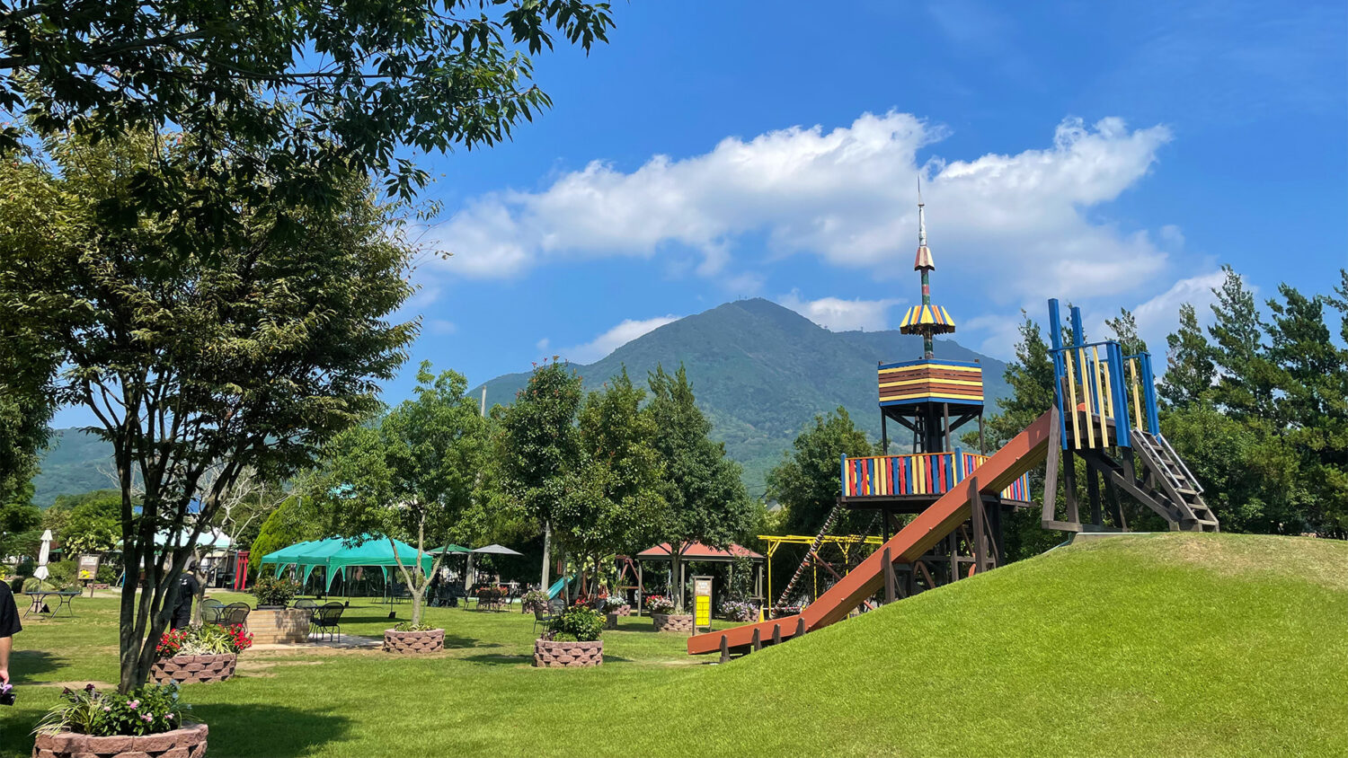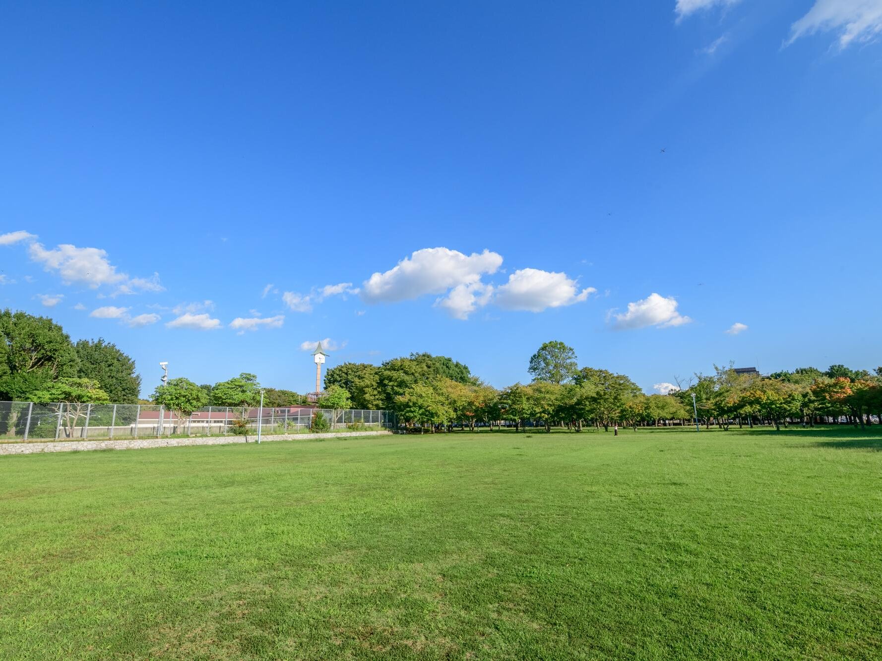帽子をかぶった時計台「和協の塔」がシンボルの広々とした公園。芝生スペースでボール遊びやピクニックができ、障がいの有無や国籍、年齢、性別に関係なくすべての子どもが共に遊べるインクルーシブ遊具も整備されていて小さなお子さんも安心です。