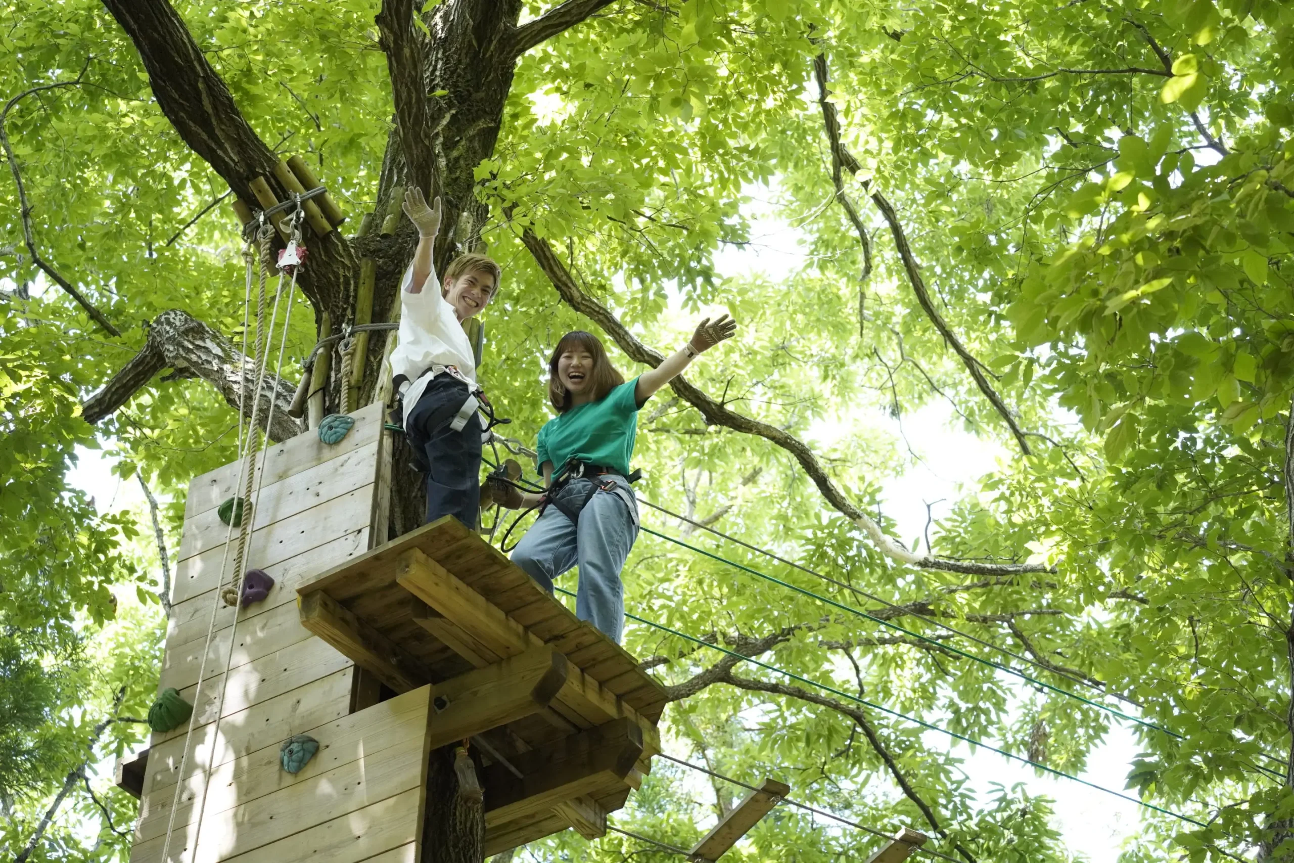 地上10m地点で樹木と樹木の間をケーブルでつなぎ、まるで森を駆け抜ける探検家のような体験が楽しめます。