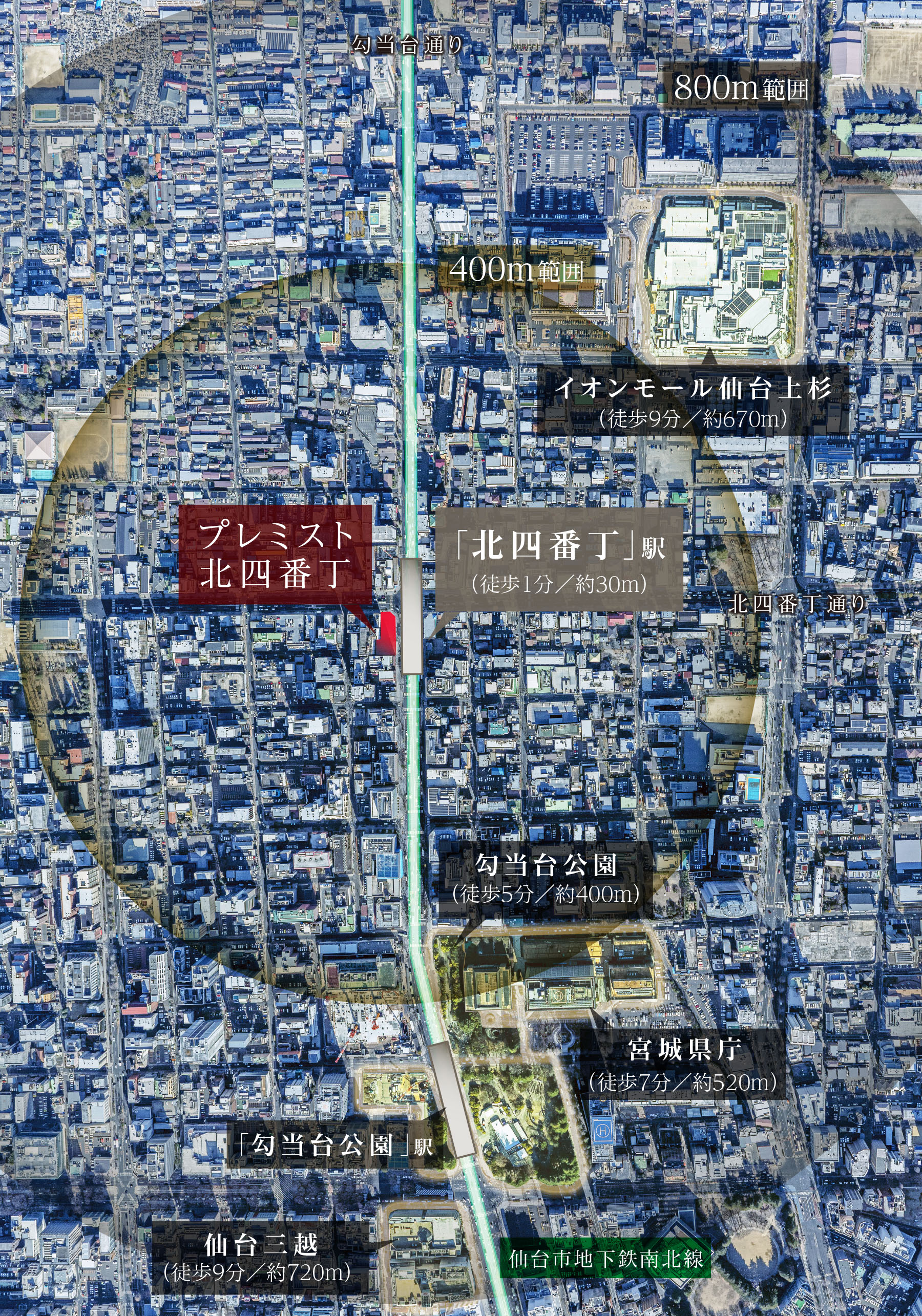 ※掲載の航空写真は、一部CG加工を施しています。また、円で表現している範囲は、物件を中心に直線400m/800mの範囲を示したもので、徒歩での移動距離とは異なります。